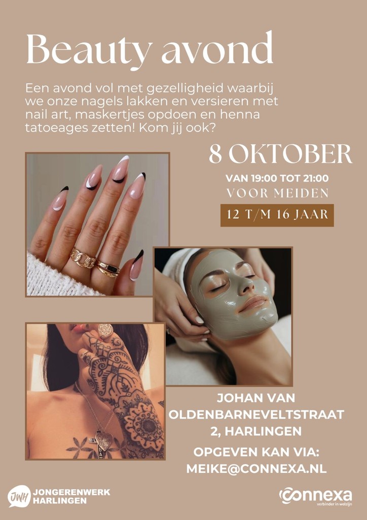 Tijdens deze avond gaan we samen met meiden van 12 t/m 16 jaar een kijkje nemen in de wereld van beauty. We gaan nagels lakken en versieren met nail art, maskertjes opdoen en henna tatoeages zetten (die maar enkele dagen blijven zitten).