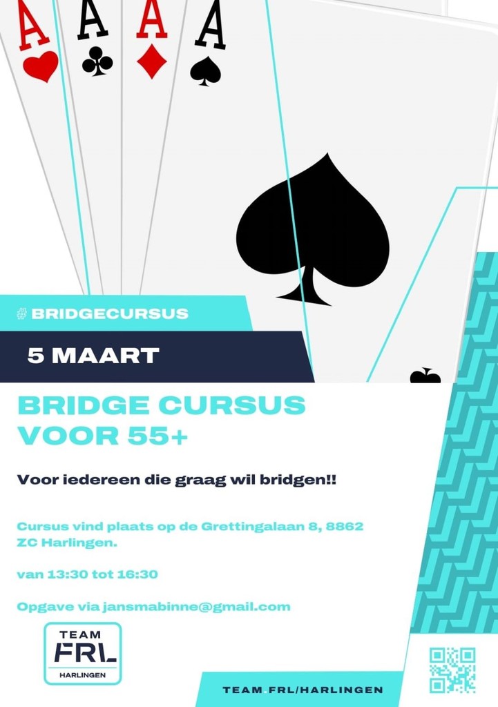 Vanaf dinsdag 5 maart kan iedereen die daar belangstelling voor heeft, zich aanmelden voor een bridgecursus. In 10 tot 12 weken leer je de beginselen van de bridgesport. De cursus vindt plaats op Grettingalaan 8 in Harlingen en start om 13.30 en duurt tot 16.00 uur.