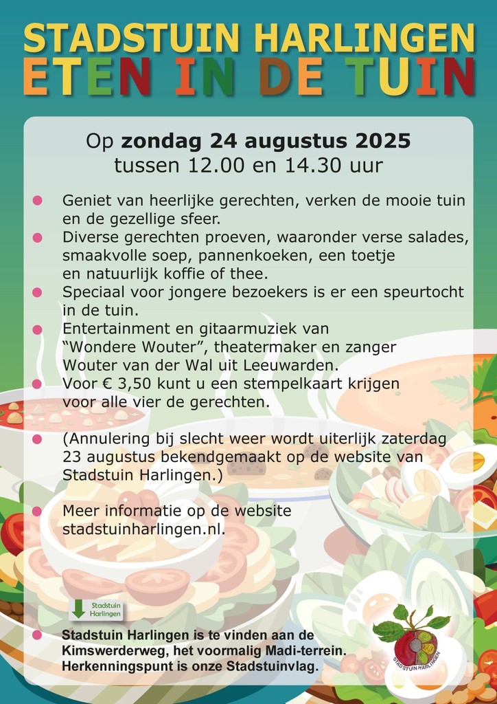 Annulering bij slecht weer wordt uiterlijk zaterdag 23 augustus bekendgemaakt op de website van Stadstuin Harlingen.