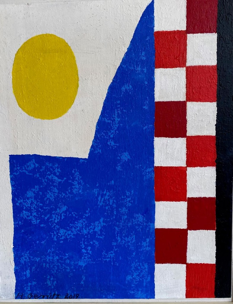 Harrie Gerritz (1940) balt in heldere, expressieve kleuren een horizon, een kerktoren en bomen samen in een verzameling horizontale en verticale lijnen en geometrische vormen. Zijn ‘geconstrueerde landschappen’ weerspiegelen zijn opleiding als grafisch vormgever aan de Academie voor Beeldende Kunst in Arnhem. Maar de sobere vormen hebben wel degelijk een verhaal te vertellen. ‘Ze staan altijd weer in een ander verband tot elkaar, ze vertellen elke keer een ander verhaal. Soms is het onderwerp duidelijk: dat groen is nog altijd een strook aarde, dat blauw een lucht, onmiskenbaar een landschap. Maar wat is de essentie van dat landschap, van jezelf? De essentie van jezelf is dat je tot het landschap behoort'.