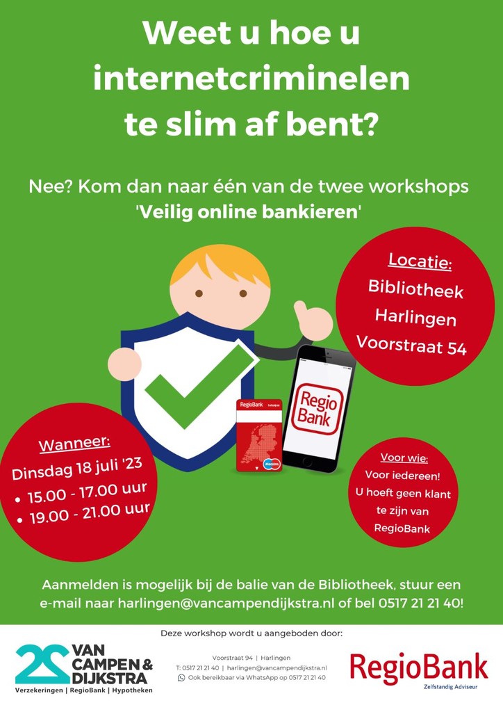 “Online betalen en financiële zaken online regelen wordt steeds normaler, maar goed inschatten wanneer u risico loopt is vaak lastig. Door proactief informatie over internetcriminaliteit te verstrekken, willen wij deze risico’s herkenbaar maken”, aldus Camilla. Zij is Adviseur Bankzaken bij de RegioBank vestiging in Harlingen, de enige bank in Harlingen.