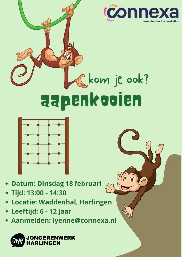 Op dinsdag 18 februari staat een sportieve activiteit op het programma: apenkooien. Kinderen kunnen rennen, springen en klauteren in de gymzaal en proberen uit de handen van de tikkers te blijven.