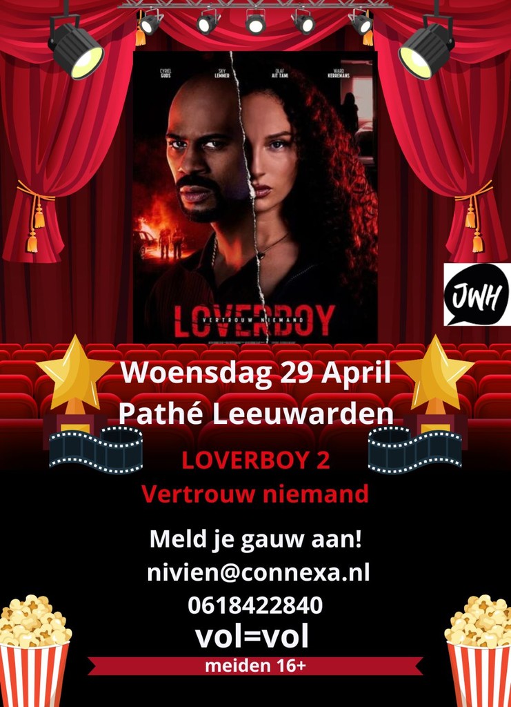 In de middag gaan we gezamenlijk naar de film Loverboy 2 Vertrouw Niemand in Pathé Leeuwarden. De eigenbijdrage voor deze activiteit bedraagt €5,-. De deelnemers dienen zelf hun eigen vervoer naar Pathé Leeuwarden. De exacte vertrektijd en verdere praktische informatie worden na aanmelding gedeeld.