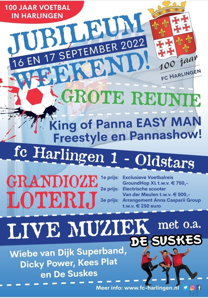 Op de website www.fc-harlingen.nl is meer informatie te vinden over het jubileumweekend. Bijvoorbeeld over de grandioze loterij en welke prijzen er te winnen zijn maar er is ook meer informatie over de mogelijkheid om Vriend van het Jubileum te worden.