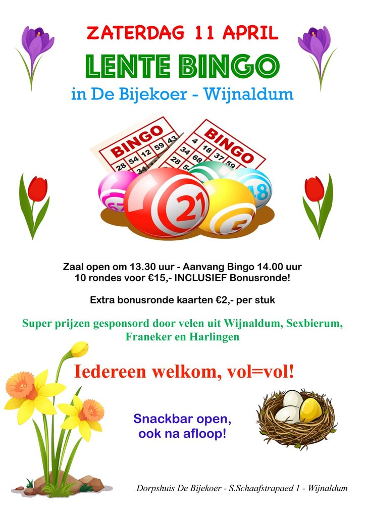 Op zaterdag 11 april organiseert Dorpshuis De Bijekoer in Wijnaldum een vrolijke Lente Bingo met prachtige prijzen, mogelijk gemaakt door sponsoren uit Wijnaldum, Sexbierum, Franeker en Harlingen.