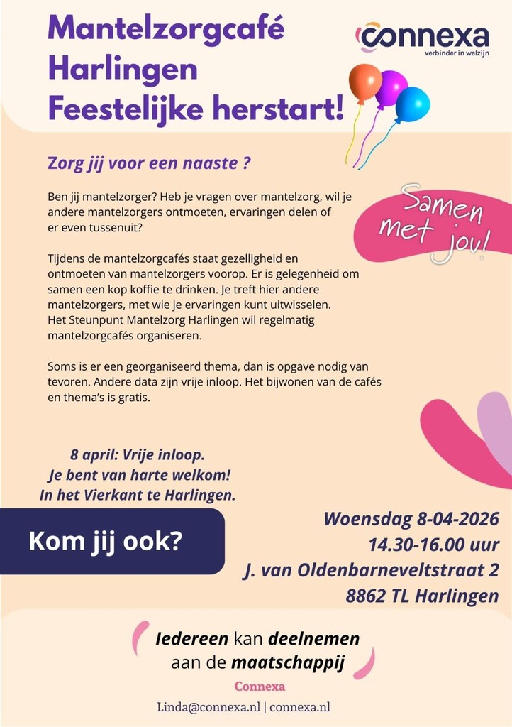 Deelname is gratis. Het Steunpunt Mantelzorg Harlingen (Connexa) organiseert deze cafés regelmatig om mantelzorgers te ondersteunen en met elkaar te verbinden.