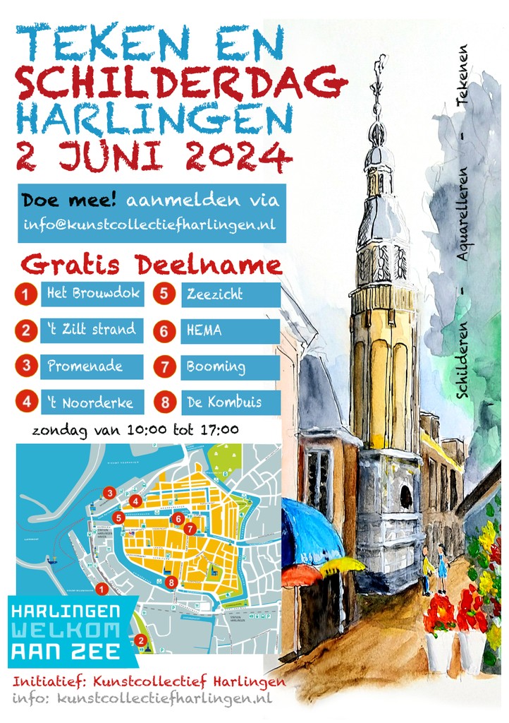 Op zondag 2 juni 2024 kunnen groepjes (amateur)kunstenaars schilderen/tekenen op één van de 8 geselecteerde mooie locaties in Harlingen aan de rand van het historisch centrum langs het binnenwater of met zicht op zee. De start- en eindlocatie is bij Het Brouwdok, Nieuwe Willemskade 8 8862 RZ Harlingen. Zie informatie in bijgaande flyer.