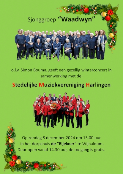 Graag nodigen wij u uit voor het winter/kerstconcert op 8 december met sjonggroep "Waadwyn" samen met de Stedelijke Muziekvereniging Harlingen in de Bijekoer te Wijnaldum.