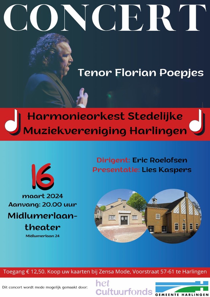 De Stedelijke Muziekvereniging Harlingen zal wat concerten betreft de spits afbijten. Als speciale gast komt tenor Florian Poepjes zijn opwachting maken.