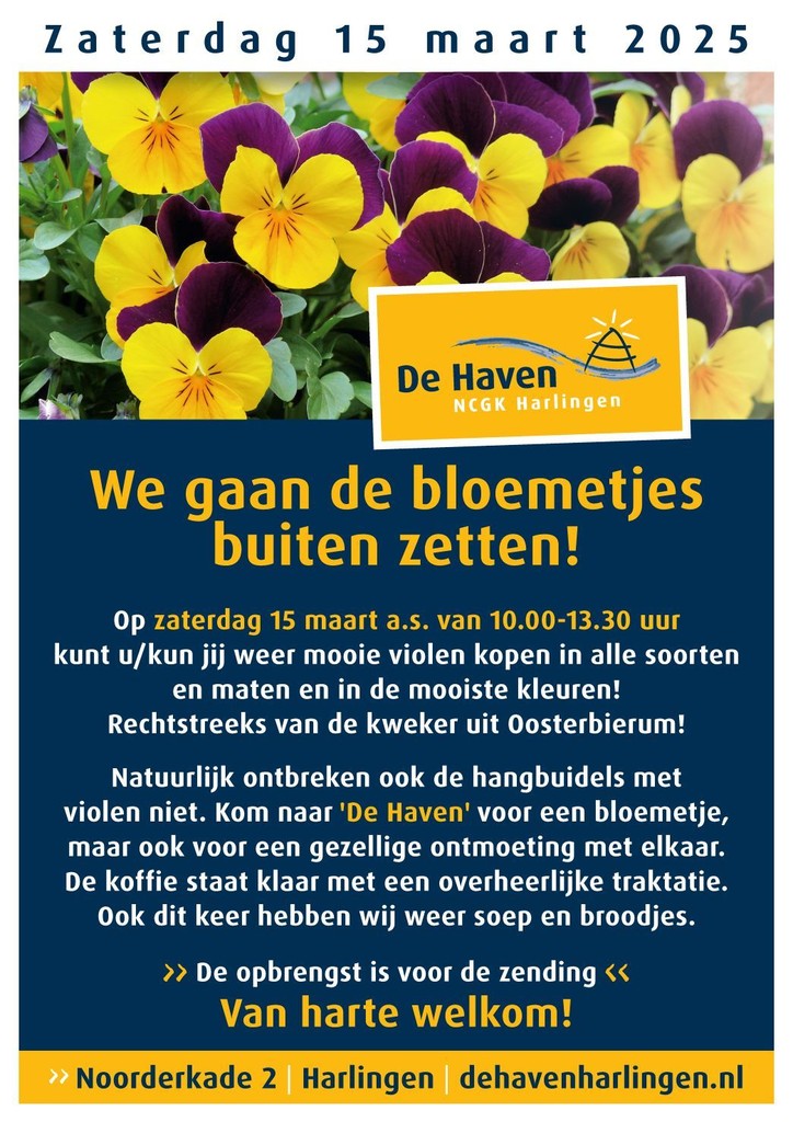 Kom zaterdag 15 maart a.s. naar “de Haven” Noorderkade 2 te Harlingen. Hier is de verkoop van mooie violen in alle soorten en kleuren en natuurlijk ook de mooie hangbuidels met viooltjes, rechtstreeks van de kweker uit Oosterbierum (Krijgsheld)