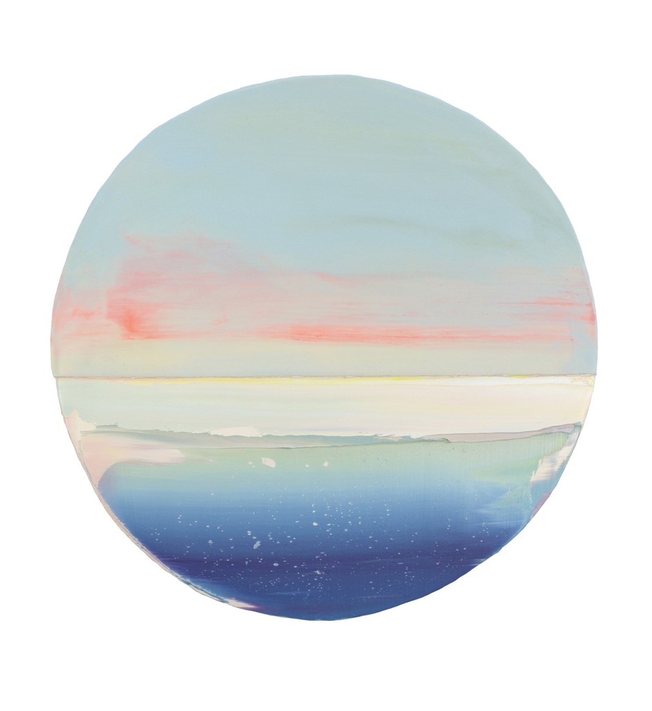 Soms kijk je naar een diepblauwe lucht waarin zich een weersverandering aftekent, de andere keer naar het waterspoor in het kielzog van het schip. In haar nieuwste tentoonstelling bij Galerie de Vis in Harlingen lijkt ze het ook hogerop te zoeken: de ronde beschilderde schijven die ze presenteert, lijken aan de muur als hemellichamen te zweven.