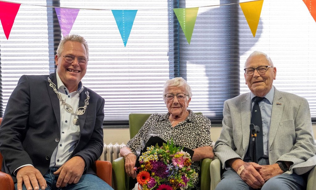 Loco-burgemeester Hendrik Sijtsma heeft het echtpaar maandag 8 augustus namens het gemeentebestuur van Harlingen gefeliciteerd met hun 65 jarig huwelijk.
