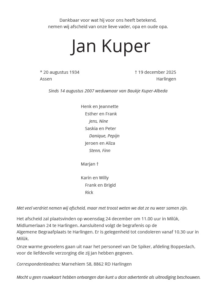 HARLINGEN - Vrijdag 19 december is Jan Kuper op 91-jarige leeftijd overleden.