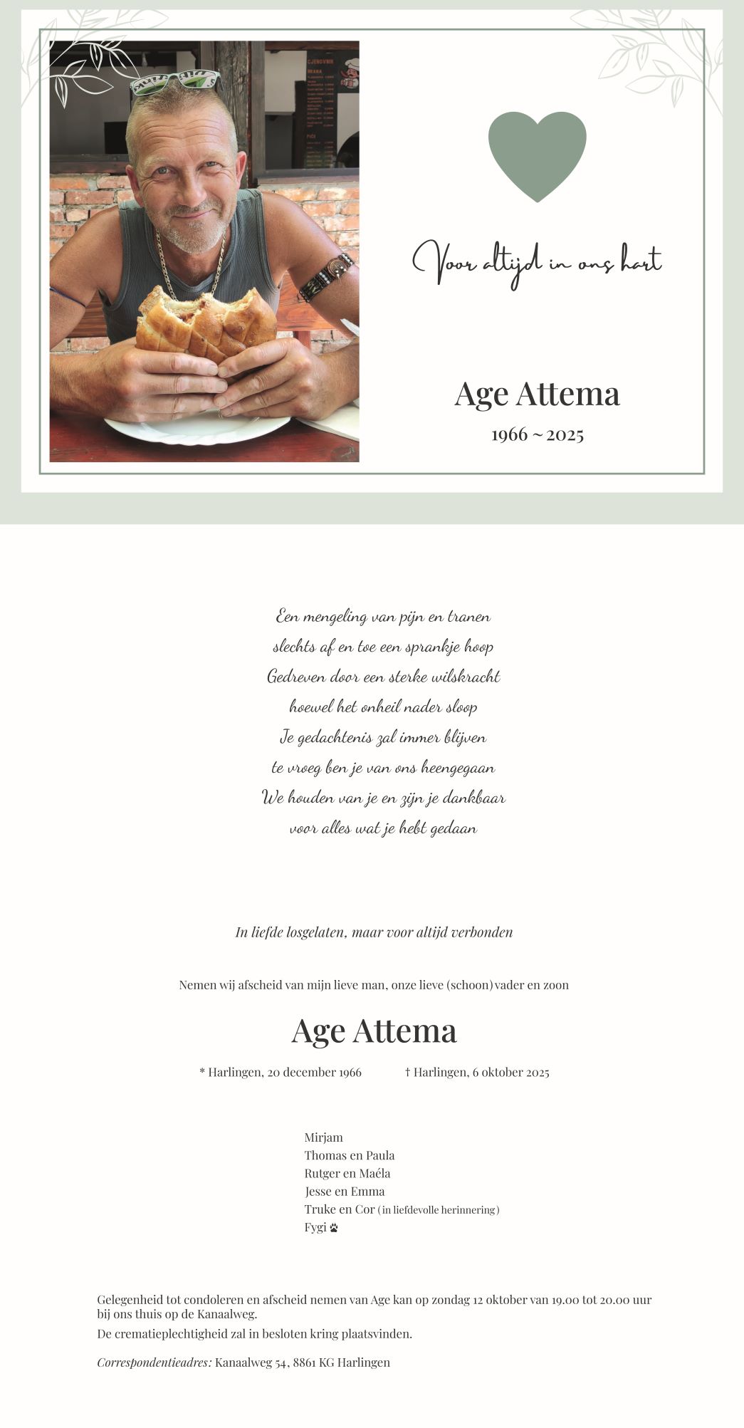 HARLINGEN - Maandag 6 oktober is Age Attema op 58-jarige leeftijd overleden.