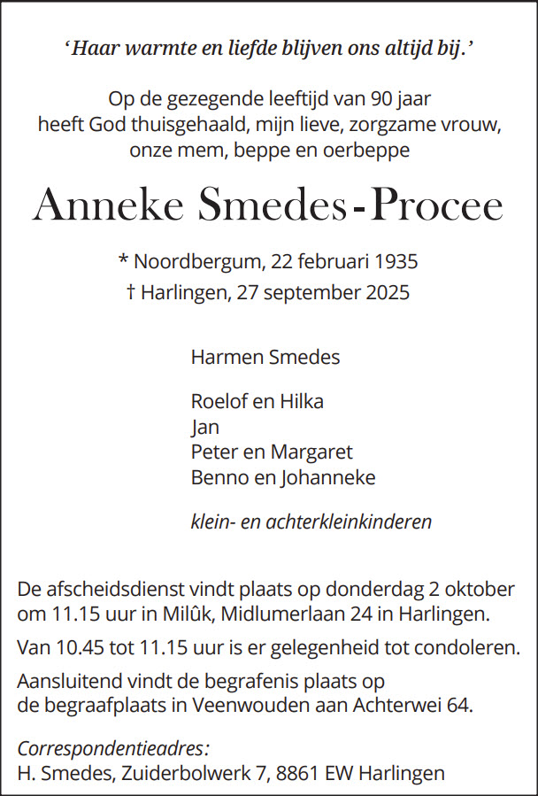 HARLINGEN - Zaterdag 27 september is Anneke Smedes-Procee op 90-jarige leeftijd overleden.