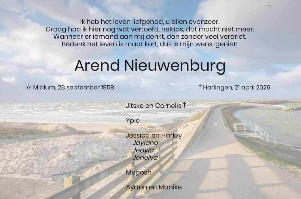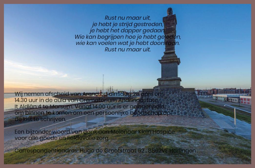 HARLINGEN - Dinsdag 21 april is Arend Nieuwenburg op 66-jarige leeftijd overleden.