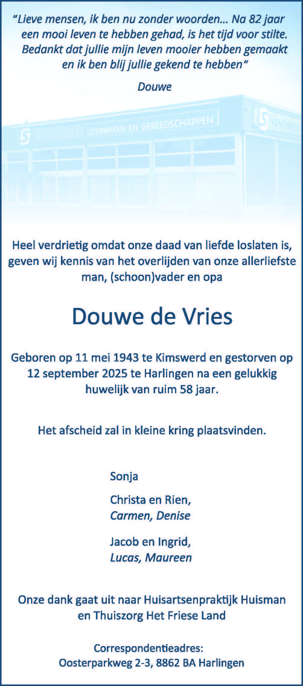 HARLINGEN - Vrijdag 12 september is Douwe de Vries op 82-jarige leeftijd overleden.