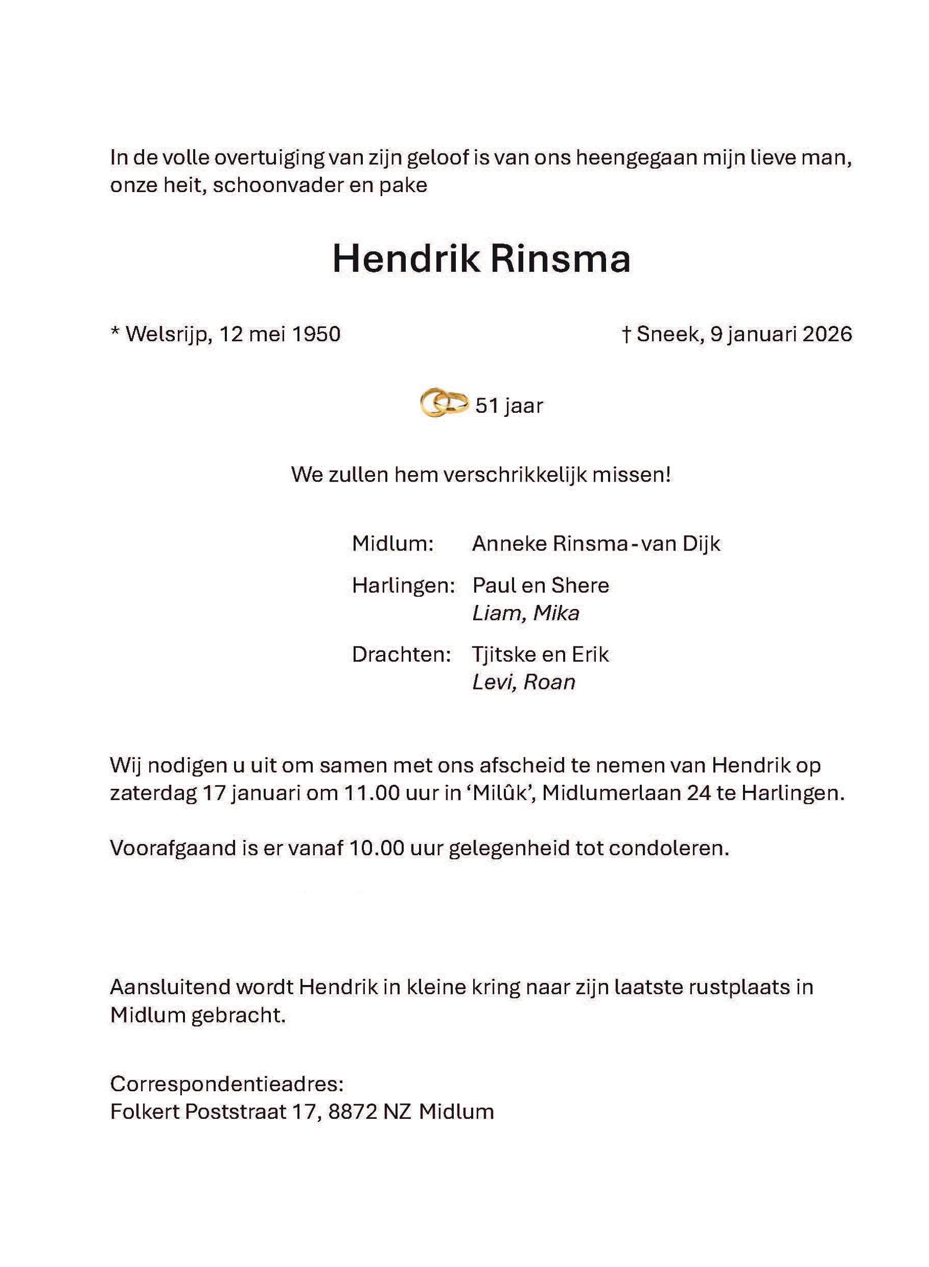 HARLINGEN - Vrijdag 9 januari is Hendrik Rinsma op 75-jarige leeftijd overleden.