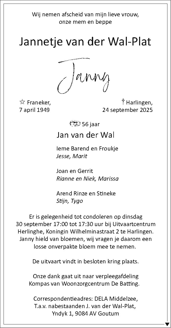 HARLINGEN - Woensdag 24 september is Jannetje (Janny) van der Wal-Plat op 76-jarige leeftijd overleden.