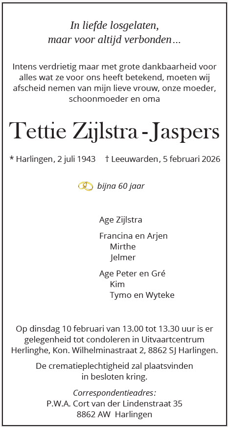 HARLINGEN - Donderdag 5 februari is Tettie Zijlstra-Jaspers op 82-jarige leeftijd overleden.
