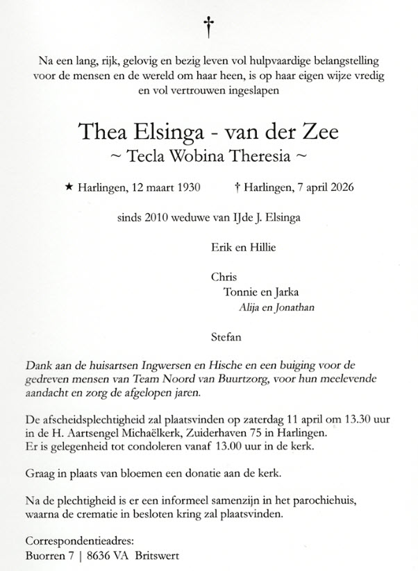 HARLINGEN - Dinsdag 7 april is Thea (Tecla Wobina Theresia) Elsinga - van der Zee op 96-jarige leeftijd overleden.