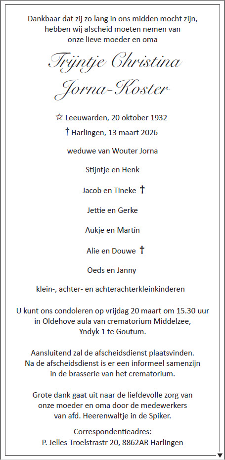 HARLINGEN - Vrijdag 13 maart 2026 is onze moeder en oma op 93-jarige leeftijd overleden.