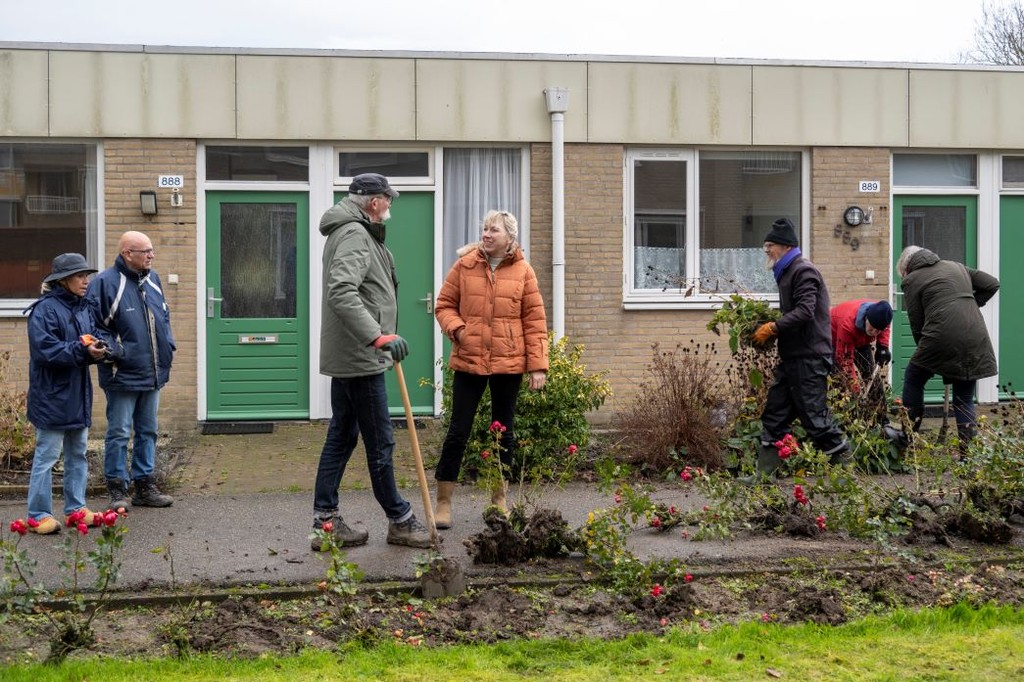 Hortensia’s, rozenstruiken en heesters zijn gered en verhuizen naar hun nieuwe tuin. ‘Voor de sloop van het eerste blok hebben we deze actie ook gedaan. Dat was in 2022, daar was toen veel animo voor. Mooi om te zien dat we mensen in Harlingen nu weer blij maken en dat zij de planten een nieuwe plek bieden in hun tuin’, Anja Feenstra, communicatieadviseur bij de Bouwvereniging.