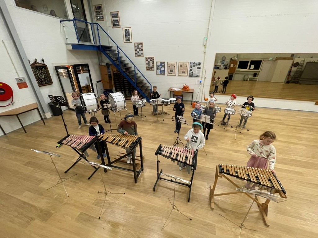 Alle slagwerkinstrumenten worden uit de kast gehaald; van grote basedrum tot tamboerijn.