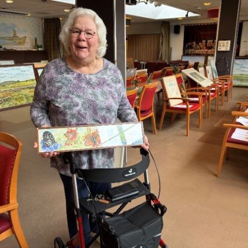 Door de aanstaande sloop en nieuwbouw kunnen de kunstwerken niet mee naar het nieuwe gebouw aan de Sien van Hulstlaan. Daarom zijn ze verkocht, met één belangrijk doel: een bijdrage leveren aan de inrichting van de nieuwe ontmoetingsruimte. De verkoop leverde in totaal € 1.415 op – een mooi bedrag waarmee we samen al een goede start kunnen maken.