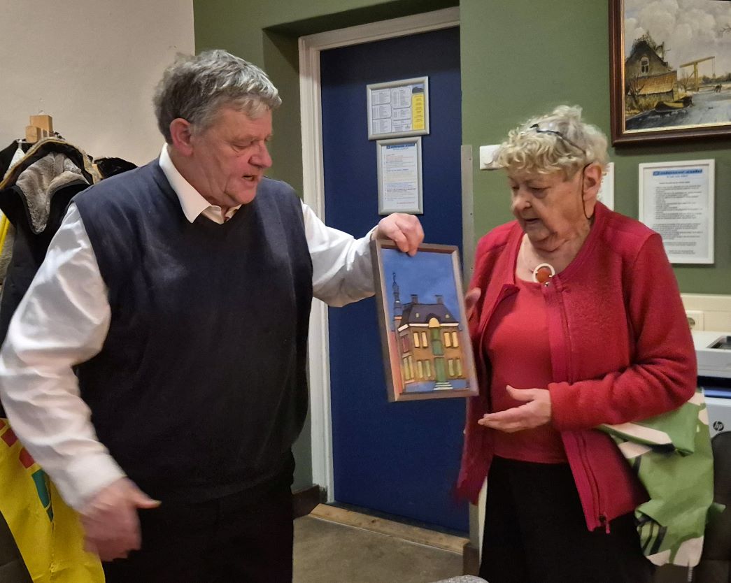 Afdelingssecretaris Joop van der Heide overhandigt aan Janny Travaille een aandenken aan haar politieke carrière in Harlingen: het stadhuis!