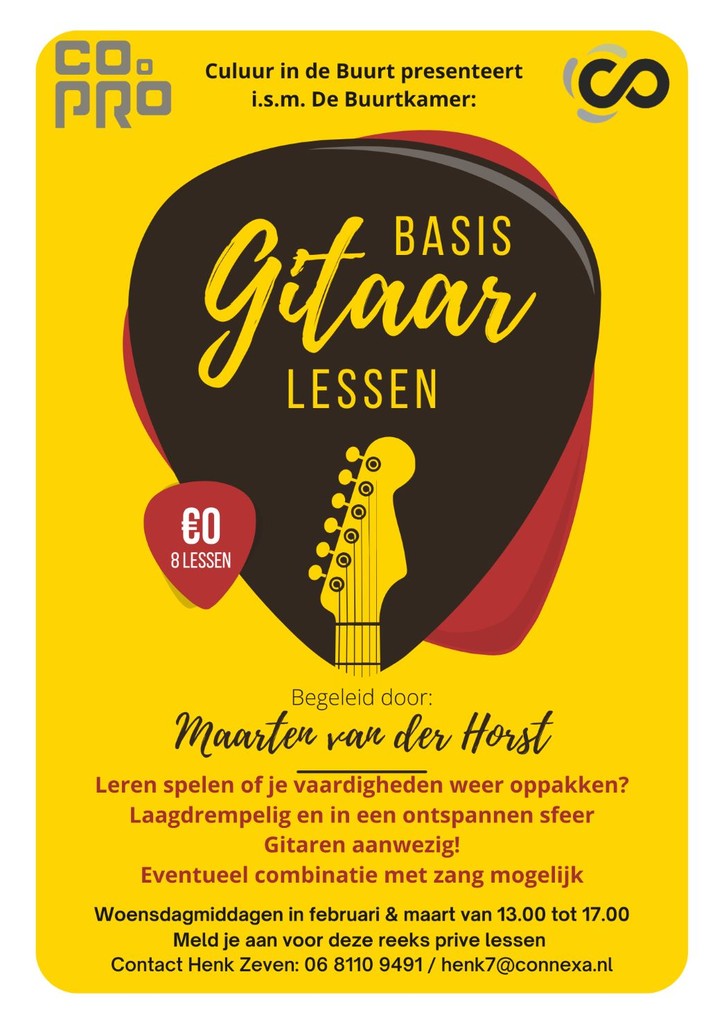 In samenwerking met de Buurtkamer en CoPro gaat Maarten 8 woensdagmiddagen in februari en maart privé lessen geven. De lessen duren 30 minuten en zijn zeer laagdrempelig. Deelnemers hoeven nog geen kennis en kunde op het instrument te hebben, en er staat een gitaar ter beschikking voor hen klaar. "We gaan voor een ontspannen sfeer, en men mag zelf aangeven wat zij graag zouden willen leren".