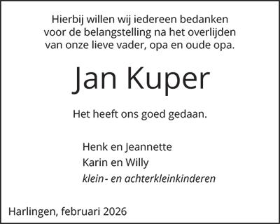 HARLINGEN - Op verzoek plaatsen wij hieronder een dankbetuiging na het overlijden van hun dierbare.