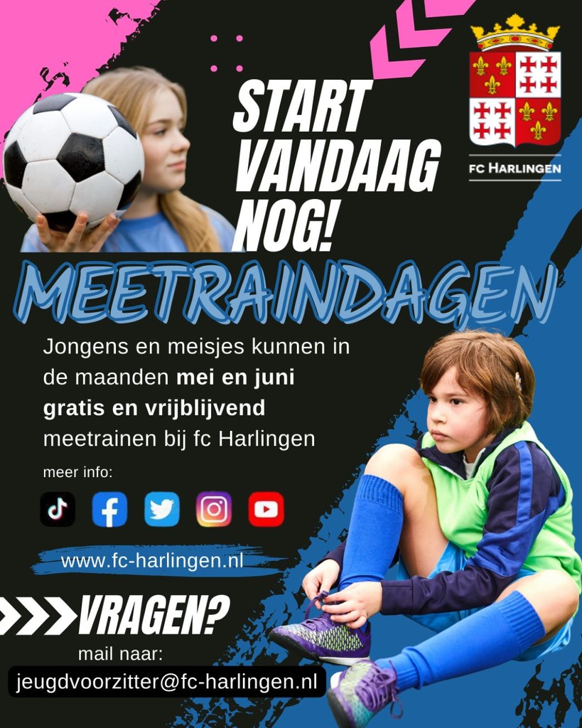 Fc Harlingen zit nog vol in het huidige seizoen, maar kijkt ook al vooruit naar het nieuwe seizoen (2025-2026). Een nieuw seizoen waarin fc Harlingen gaat starten met jeugdteams in de leeftijdscategorieën: JO7, JO8, JO9, JO10, JO11, JO13, JO15, JO17 en JO19. En bij de meisjesteams wordt er gestart met de leeftijdscategorieën: MO11, MO13, MO15, MO17 én MO20. Heb jij de ambitie om (weer) op voetbal te gaan? Doe dan mee met de meetraindagen!