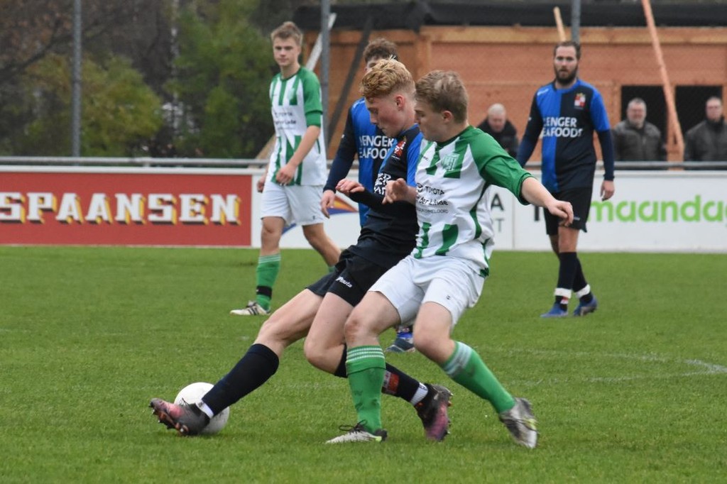 Fc Harlingen leek daarna door te drukken. Een hakje van Bas Helfferich zette Remko Zandberg vrij, die de bal perfect klaarlegde voor Jesse Mulder. Jesse haalde hard uit, maar de lat stond zijn goal in de weg. Aan de andere kant was het direct chaos. Oldemarkt bleef de lange bal zoeken op hun razendsnelle spitsen en in de zestien was het meermaals alle hens aan dek voor fc Harlingen.