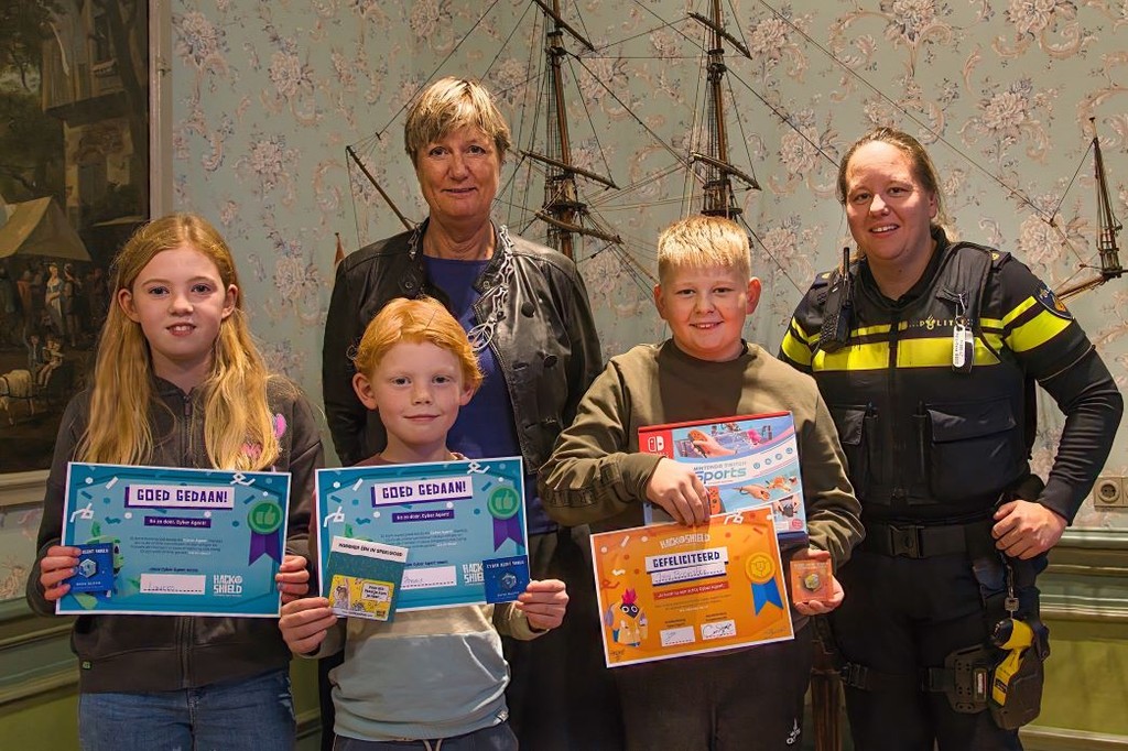 De winnaars werden samen met hun familie verwelkomd door burgemeester Ina Sjerps, drie politieagenten en twee boa’s. De burgemeester heeft de Junior Cyber Agents gefeliciteerd met hun prestatie. Onder het genot van een taartje kregen de winnaars een certificaat uitgereikt en hebben zij hun prijs in ontvangst genomen. Helaas was Stijn afwezig, hij haalt zijn prijs later op.