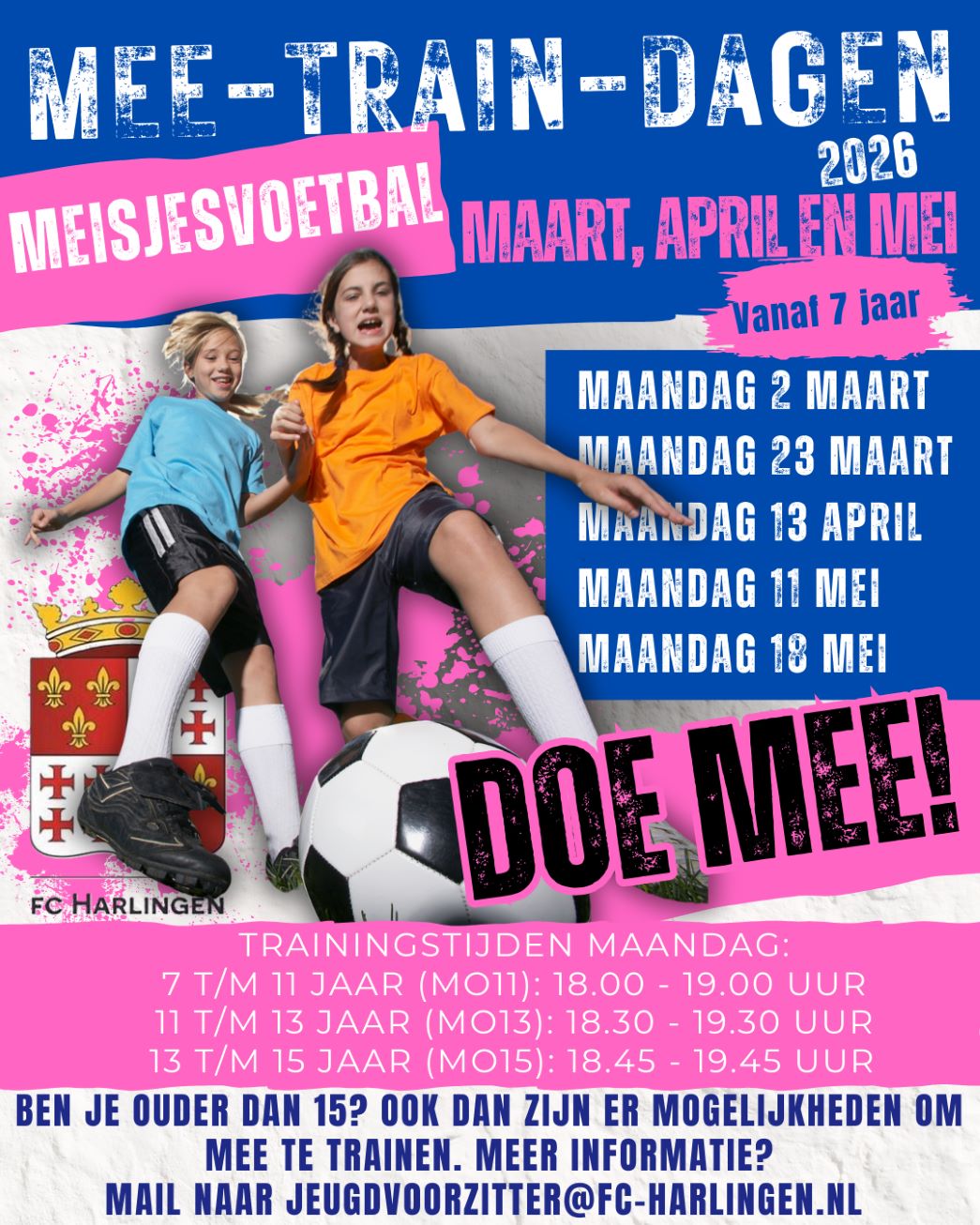 Voor het derde jaar op rij organiseert fc Harlingen de mee-train-dagen. De vraag om een keer mee te doen groeit. Sommige meiden zijn nieuwsgierig omdat een vriendin al bij fc Harlingen voetbalt, anderen willen de sport ontdekken of juist weer oppakken. Tijdens de mee-train-dagen kunnen zij gratis en vrijblijvend aansluiten bij de training van hun eigen leeftijdsgroep.