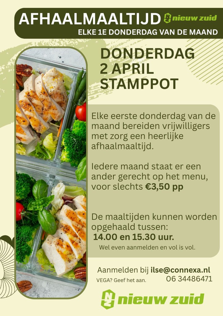 De eerste afhaalmaaltijd zal zijn op donderdag 2 april ‘’stamppot’’. Houdt hierna de Facebook of nieuwsbrief in de gaten voor de volgende afhaalmomenten.