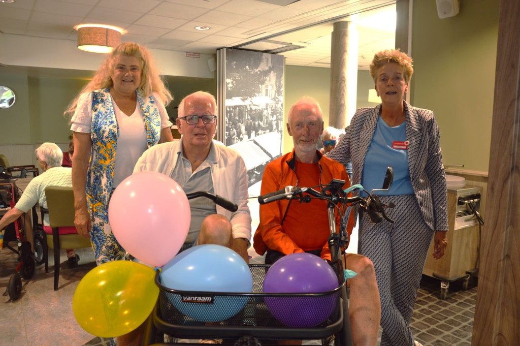 Behendig reden ze de met ballonnen versierde fiets door de gangen van De Spiker. Pietsje van der Wal, coördinator welzijn van De Spiker, informeerde de aanwezigen over de totstandkoming van de duo fiets. “Er moest een bedrag van 10.000 euro op het kleed komen en die hadden we niet”, zei Van der Wal. “Naarstig werd een comité opgericht die op zoek ging naar de nodige sponsoren.”
