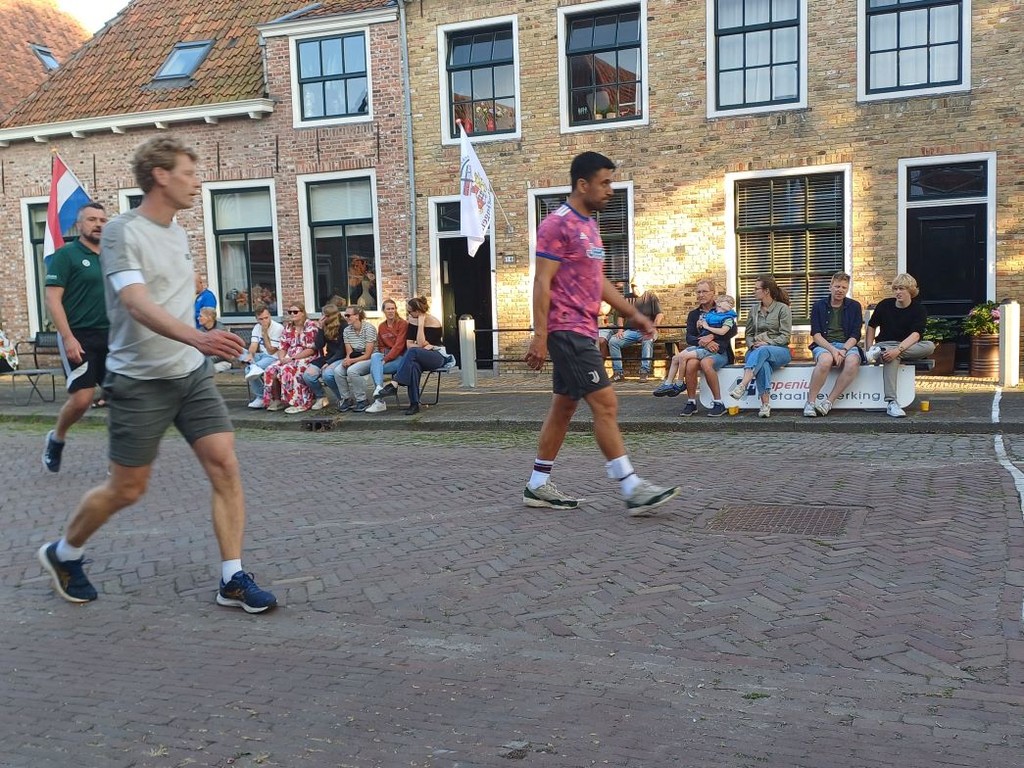 En de sfeer, die was drekt al optimaal. 't Weer was prachtig en een knorre publiek. De mannen van de karrebrigade stonnen alweer achter perk 1. Dat binne Hannes Oudendag, Albert Dijkstra en Jan de Bruin. Se gaven weer goeie adviezen, waar gien één een donder an had, maar och, we binne su blied dat se d'r weer bij binne - we kanne se echt niet misse. Age Tichelaar zat der oek bij op een zetel, hij hoefde niks te doen, nou ut leek prins Bernard wel. En bij elke bal dicht bij ut perk, wees ie toch even an wáár de kaats lag.