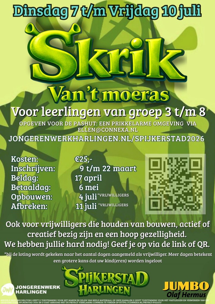 Jongerenwerk Harlingen organiseert dit jaar de kindervakantieweek van dinsdag 7 juli t/m vrijdag 10 juli. Door de Tall Ships Races beginnen we één dag later dan gebruikelijk. Het thema van dit jaar is: “Skrik in ’t Moeras”. Net als voorgaande jaren vindt Spijkerstad plaats op de ijsbaan/skeelerbaan.