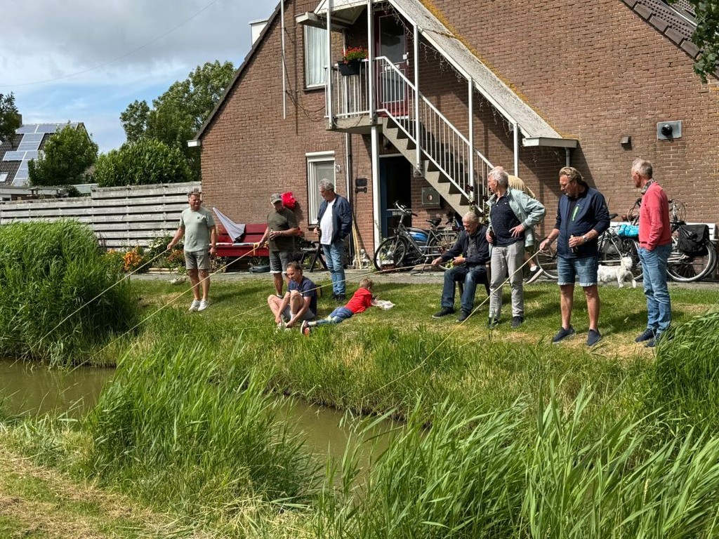 Toen ze uuteindelijk allemaal op hun plak zaten, begonnen se hard te ouwe hoeren dat de vissen met een gang richting Bolswarder vaart vlogen. Ut mooiste van de dag was wel de onze voorzitter Nico Beuker met sien vrouw Marietje even langskwamen. Daar waren we allemaal heel erg blied met. Uuteindelijk vong Peter B. een vis en oek Wiebe van Dijk en Slurp van Hurck. De skeidsrechter keurde de vis vanaf 50 meter afstand en besloot dat Peter de grootste had, nou en dat is oek se. Wiebe had de 2e en Guus Slurp had een visje dat precies bij um paste se klein was ie.
