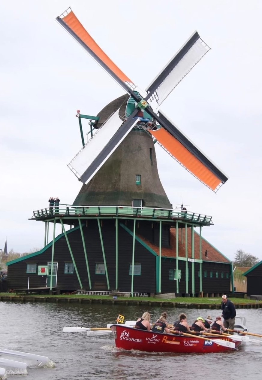 Na het palaver direct naar de sloep en klaarmaken voor de start. En een vliegende start hadden de dames. Na het eerste keerpunt, merkte we dat de sloep wat dook. De stuurman paste wat aan in de slag en het tempo en de sloep begon weer te lopen. Een mooie route bracht ons langs de Zaanse Schans en zoals eerdere jaren werden er weer veel kiekjes geschoten door de talloze toeristen.