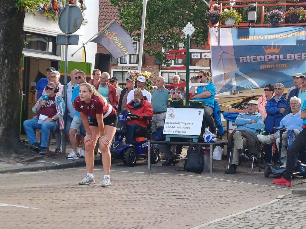 Fiera skient weer familie van Seerden te wezen, an 'e andere kant ston Hendrieke en heur broer Kees ston oek al in 'e finale. Nou lieve mesen, ut vuur vloog uut é skoenen van beide parturen en ut wudde verrotte spannend! In ut begin leek ut d'r niet op, want deur veul foutjes bij Amber hur partuur kwamen die un spul achter. Bij de stand 2-6 was d'r een mooie trik trak die Anne Brouwer (docht ik) boven sloeg 2 om 1. Toen hadden Hendrieke en heur maten wat mazzel en wudde ut: 3 om 1. Volgende eerst begon Fiera met een verre bovenslag en begonne ze d'r weer in te geloven ut wudde: 3 om 2. Bij de stand 3 om 2 en 6-6 sloeg Fiera kwaad uut en was d'r weer voorsprong voor Hendrieke heur partuur: 4 om 2. Inmiddels had un hond al un bal op sien billug kregen en keek een ander hondsje su van: “Must daar oek niet staan gaan je, os!” (zie foto). Ut wudde 4 om 3 en bij de stand 2-6 wudde de dikke kaats van Fiera niet foarby slagen: 4 om 4. Spannend, want ut wudde zelfs 5 eersten geliek en volgde d'r un bal buuten 0-2. Toen namen Amber en c.s. voor ut eerst de leiding. De mesen hadden ut zwit voor de hasses van e spanning ut wudde 4-4 kaats niet voorbij 6-4 voor Hendrieke c.s. Amber keerde de bal voor de kaats en was ut alles an 'e hang 5-5 en 6-6. De kaats leek vervolgens voorbij te gaan, maar Amber dook d'r op as un tijger en keerde de bal voor de kaats. Wat een inzet, gelukkig dat se niet zo stief is as pa Broer! Mooie partij, mooie winst, un meer as terechte Koningin: Fiera de Vries.